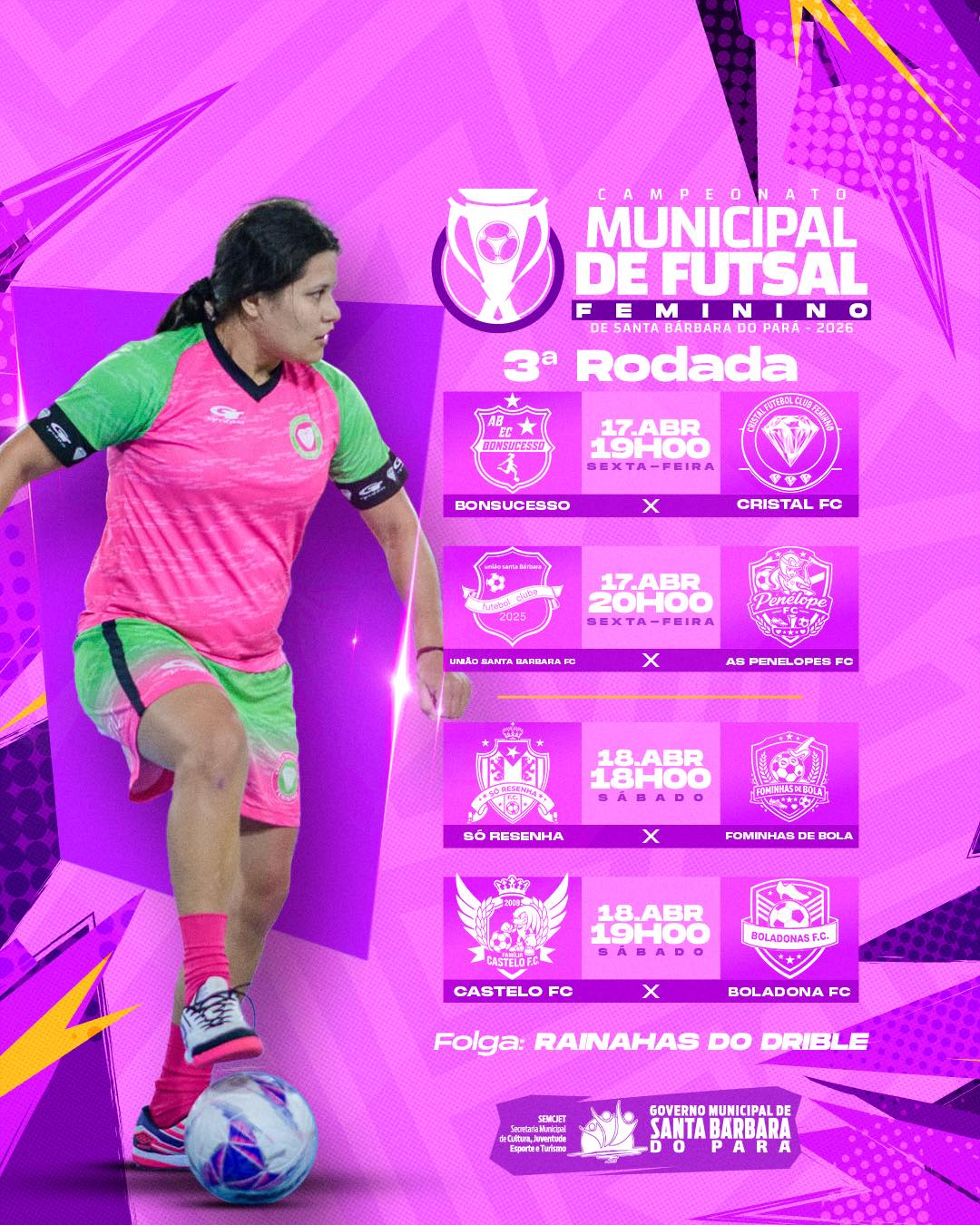 O Governo Municipal de Santa Bárbara do Pará, por meio da Secretaria Municipal de Cultura, Juventude, Esporte e Turismo (SEMCJET), convida toda a população para prestigiar mais uma emocionante rodada do Campeonato Municipal de Futsal Feminino!
