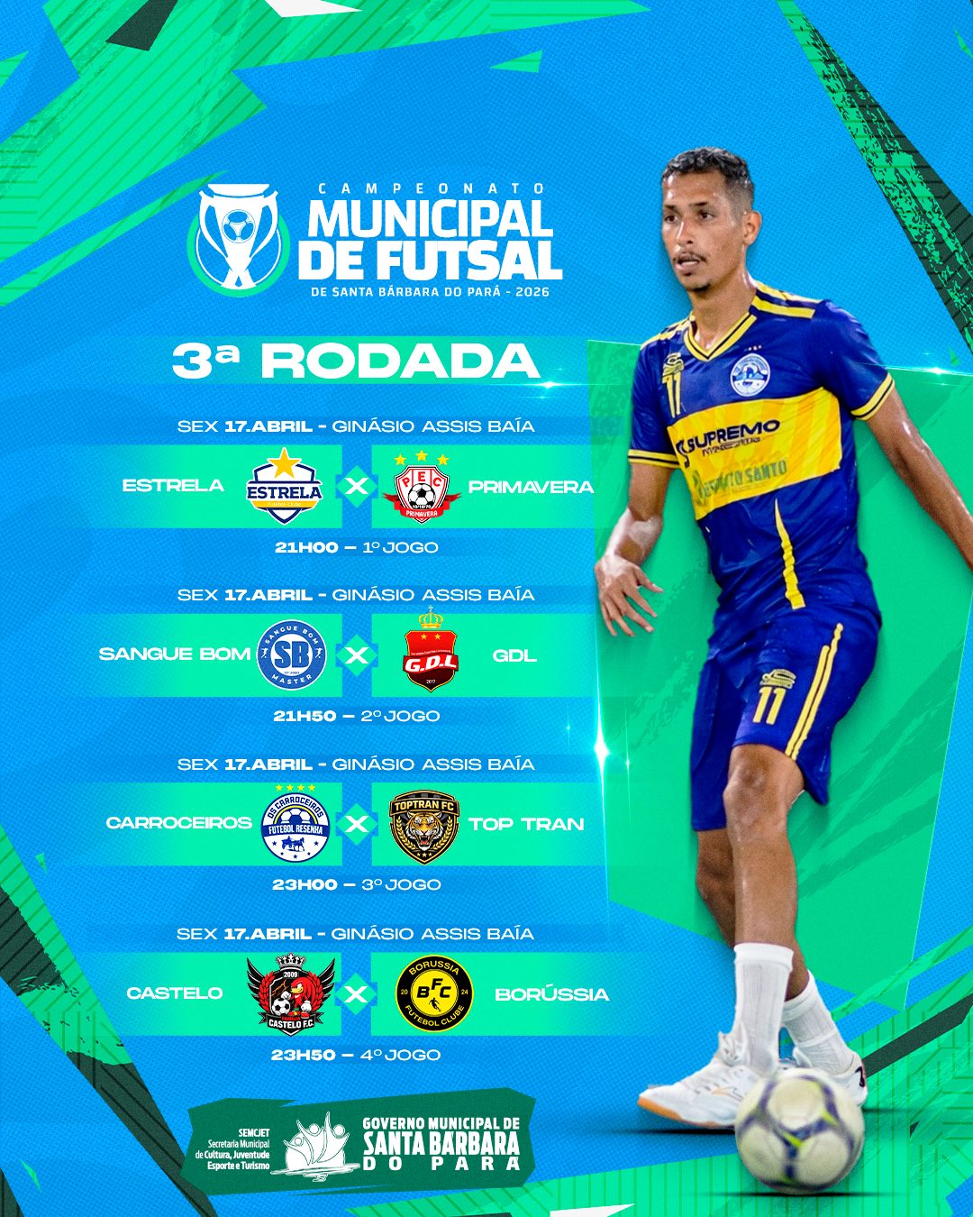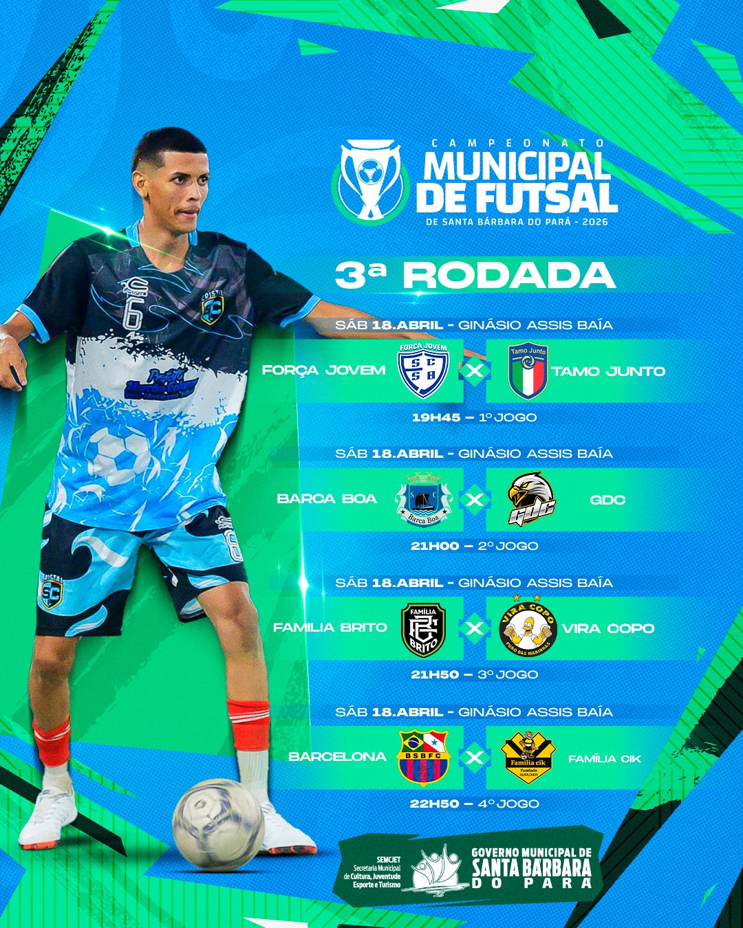 O Governo Municipal de Santa Bárbara do Pará, por meio da Secretaria Municipal de Cultura, Juventude, Esporte e Turismo (SEMCJET), convida toda a população para prestigiar mais uma grande rodada do nosso Campeonato Municipal de Futsal!