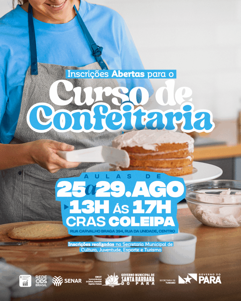 O Governo Municipal de Santa Bárbara do Pará, em parceria com o Governo do Estado do Pará e o SENAR, está ofertando o Curso de Confeitaria, uma importante oportunidade de qualificação profissional para os cidadãos barbarenses.