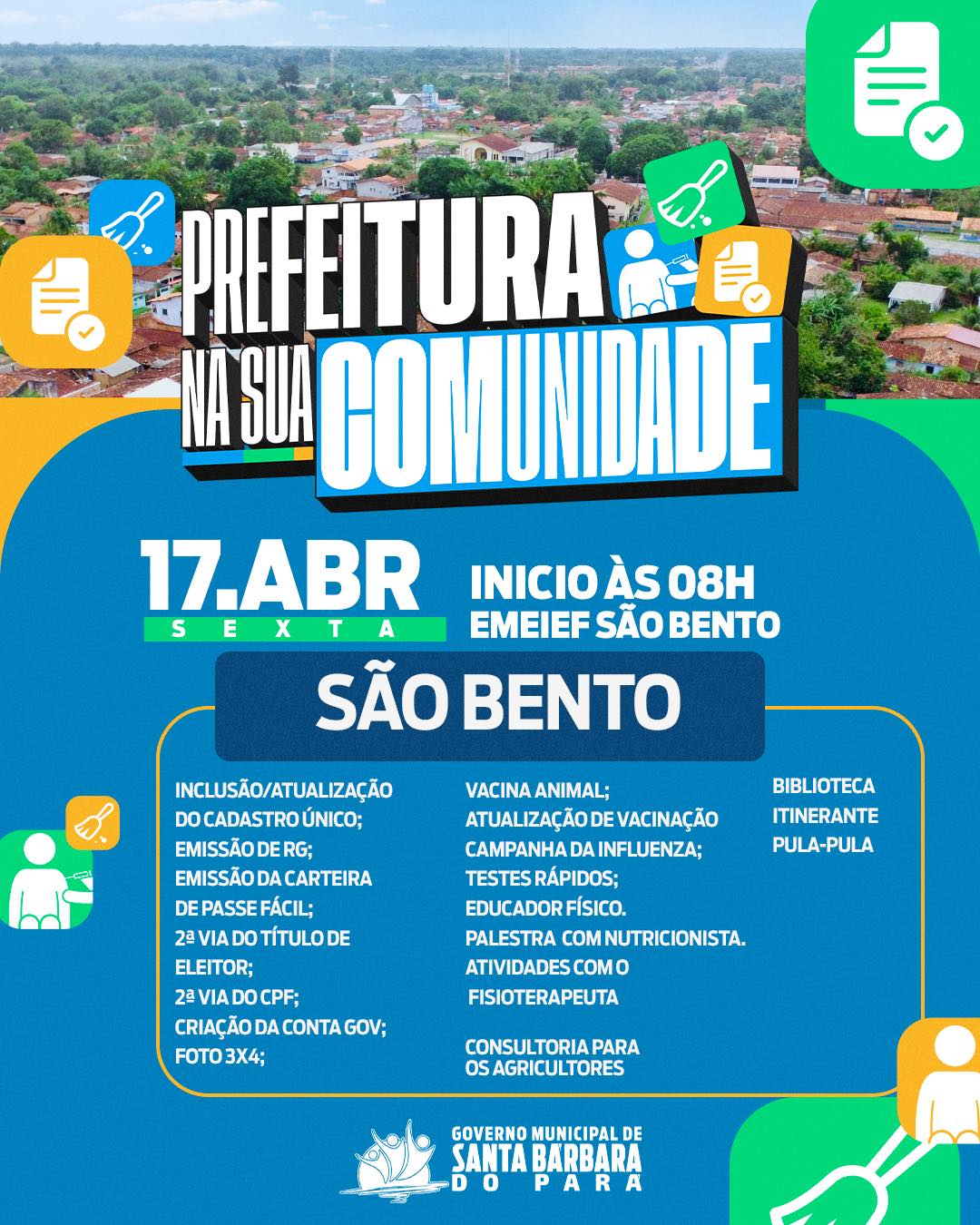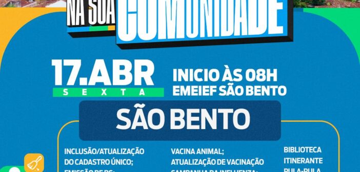 Nesta sexta-feira, 17 de abril, a ação Prefeitura na Sua Comunidade chega à comunidade de São Bento, com uma grande programação de serviços gratuitos para a população, a partir das 08h, na EMEIEF São Bento.